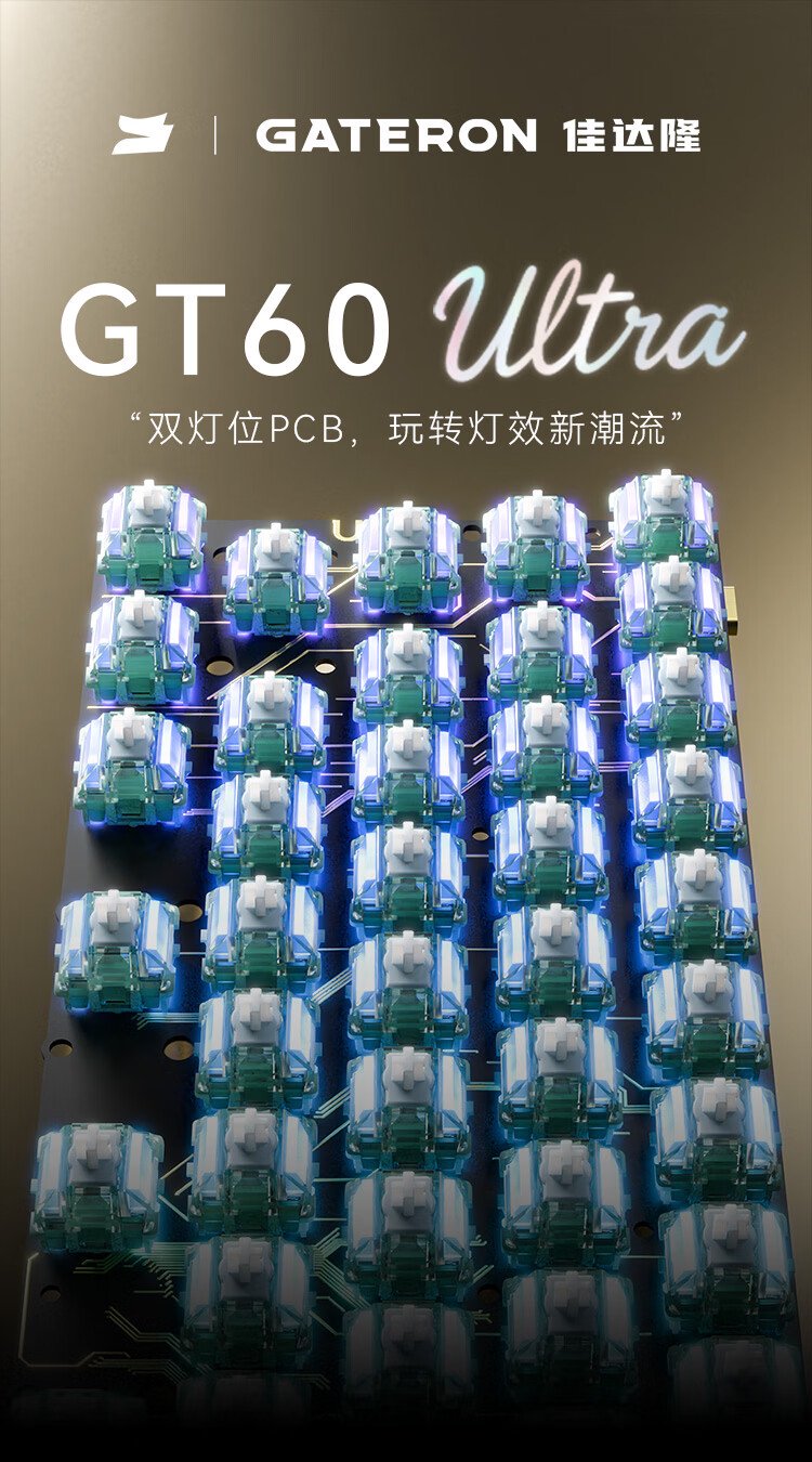 Gateron 佳達隆 GT60 Ultra PCB 磁軸鍵盤電路板 Gateron 佳達隆 GT60 Ultra PCB 為 60% 尺寸磁軸鍵盤雙燈磁軸 PCB,僅能搭配磁軸使用,不支援任何機械式軸。佳達隆強大性能核心,支援 0.005mm 高精準度,並支援三段分離式空白鍵設計。FR4 ENIG(鍍金)定位板與 PCB 用料,可透過瀏覽器設定磁軸鍵盤功能。 Gateron 佳達隆 GT60 Ultra PCB 提醒60% 尺寸 磁軸鍵盤 PCB,僅能搭配磁軸使用,不支援任何機械式軸。主要相容於 Gateron 佳達隆磁玉系列磁軸,並有經心調校,其他磁軸不保證其穩定性。請使用支援 8K 傳輸速度的 USB 線,否則支援性可能無法正常運作。此為 PCB 套件,產品不包含鍵盤外殼、磁軸、鍵帽、線材。 佳達隆雙 LED PCB:引領燈光效果新潮流Gateron 佳達隆 GT60 Ultra PCB 的每個按鍵都提供雙LED PCB 精密加工設計,掌控每個關鍵時刻。雙層燈光,定義桌面美學的每一寸。示意圖片軸體為 Gateron 佳達隆雙燈磁玉 Pro (Jade PRO Dual-SMD),完美支援佳達隆 Gateron GT60 Ultra PCB 的雙 LED PCB 效果顯示。 雙 LED 設計提供 360° 沉浸式發光體驗雙向(上/下)LED PCB 相容所有鍵帽背光效果與軸體感受。 360° 沉浸式燈光效果帶來雙倍層次體驗感,字體在上或許為側印透光字體都能營造出完美的光影氛圍。 佳達隆強大性能核心Gateron 佳達隆 GT60 PRO+ PCB 支援 8K Polling Rate,低延遲 0.125ms,以及 32K 掃描速度與全鍵無衝 NKRO (N-key Rollover)。 Gateron PCB 旗艦級防水系統採用全覆蓋奈米塗層和無鉛焊料塗層(HASL)PCB,增強訊號穩定性。無論液體潑濺,例如可樂、咖啡或奶茶,直接清洗也不會損壞。( 僅 PCB 防水,請注意 USB Type-C 接頭不防水 ) 0 幀瞬間即停 RT 精確控制佳達隆 Gateron PCB 提供極致精準度可達 0.005mm。快速觸發,瞬間急停腳步反應。 ENIG 化學鎳金技術 PCBPCB 電路板為 ENIG (Electroless Nickel Immersion Gold,無電鍍鎳浸金) 技術處理,又稱為化鎳浸金板、沉鎳金。增強訊號完整性穩定性,無損高頻訊號,實驗室級耐腐蝕性特色。 Gateron X AVKE 聯合開發全新升級軟體架構和硬體 PCB 設計,並升級最新型霍爾感測器。Gateron X AVKE 聯合開發「混合雲演算法 Hybrid Cloud Algorithm」,開創即時軸體識別,真正即插即用體驗,自動檢測每個鍵盤軸體的類型和行程,動態匹配最佳演算法,每次按鍵都能提供精準反饋。雲端設定:https://gamelife.longeplay.cn/ 萬花筒般的雲端燈光效果佳達隆 Gateron PCB 驅動程式預先安裝了數千種燈光效果,可實現即時同步。支援自訂編輯,並可一鍵切換。光影變幻,節奏盡在指尖。透過快捷鍵 FN + U 雙層燈光特效,支援即時渲染,帶來更明亮、更清晰、更流暢的視覺盛宴,真正的「8K 級」視覺奇觀。 專利三段分離式空白鍵設計分離式空白鍵可與標準 6.25u 空白鍵自由互換,滿足不同使用者的多樣化需求。實際使用較短的分離式空白鍵相比標準 6.25u 版本,穩定性更佳。它確保更高的操作精度,同時帶來更悅耳的音色和更輕盈、更靈敏的觸覺回饋。與單一的長空格鍵不同,三段式分離式設計意味著更大的客製化潛力、更高的 DIY 靈活性,為您的鍵盤帶來無限可能。 聲學工程設計,卓越音質體驗全新升級的 Gateron 佳達隆 GT60 Ultra PCB 套件,預裝FR4 ENIG(鍍金)定位板以及佳達隆定位板衛星軸。提供三層吸音墊設計,消除空腔共振,純淨悅耳的PET海綿帶來清晰純淨的按鍵聲音。 佳達隆 Gateron GT60 Ultra PCB 磁軸鍵盤電路板 官方介紹 (簡體) 產品規格與技術支援產品名稱(中文):GT60 Ultra 電路板產品名稱(英文):GT60 Ultra PCB廠商名稱:Gateron 佳達隆廠商網站:https://gateron.cn/廠商網站: https://www.gateron.com/產品網頁:https://www.gateron.com/products/gateron-gt60-ultra-he-magnetic-keyboard-pcb-dual-led-glow-pcb?VariantsId=11552支援軸體:磁軸 (不支援機械軸)雲端設定:https://gamelife.longeplay.cn/建議售價:新台幣4490元